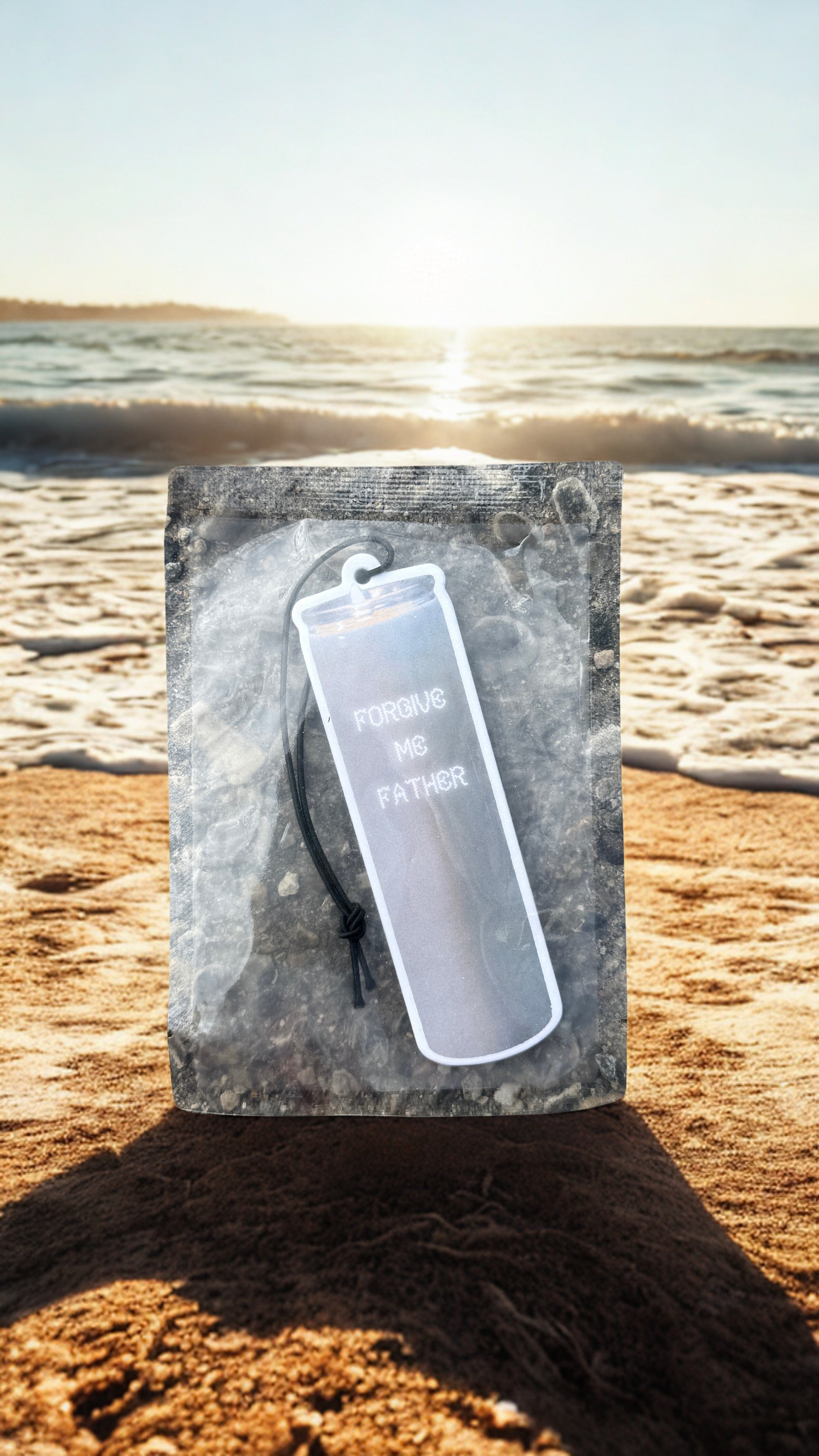 Sleek and symbolic, this double-sided air freshener features the phrase “FORGIVE ME FATHER” printed over a candle design. A bold visual for your car, studio, or space. Sized 10×3cm, it’s a subtle reminder of reflection and growth while keeping your surroundings fresh.